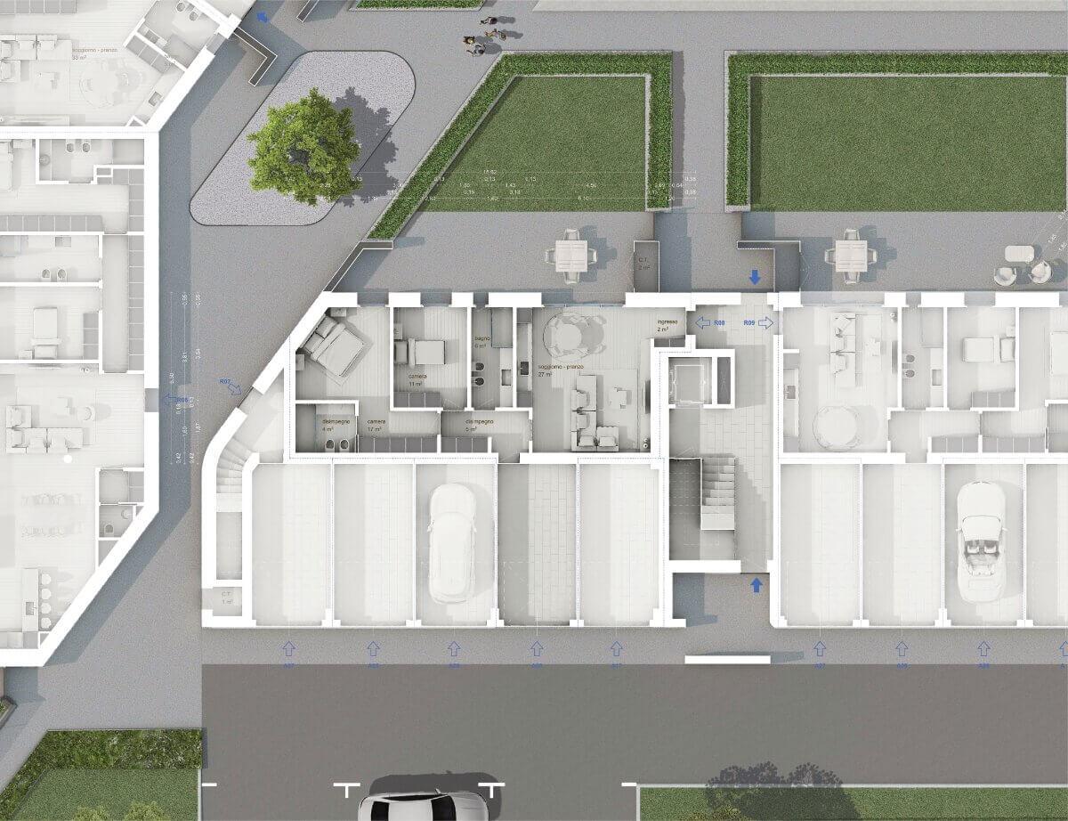 soggiorno-pranzo, disimpegno, 2 bagni, 2 camere, garage